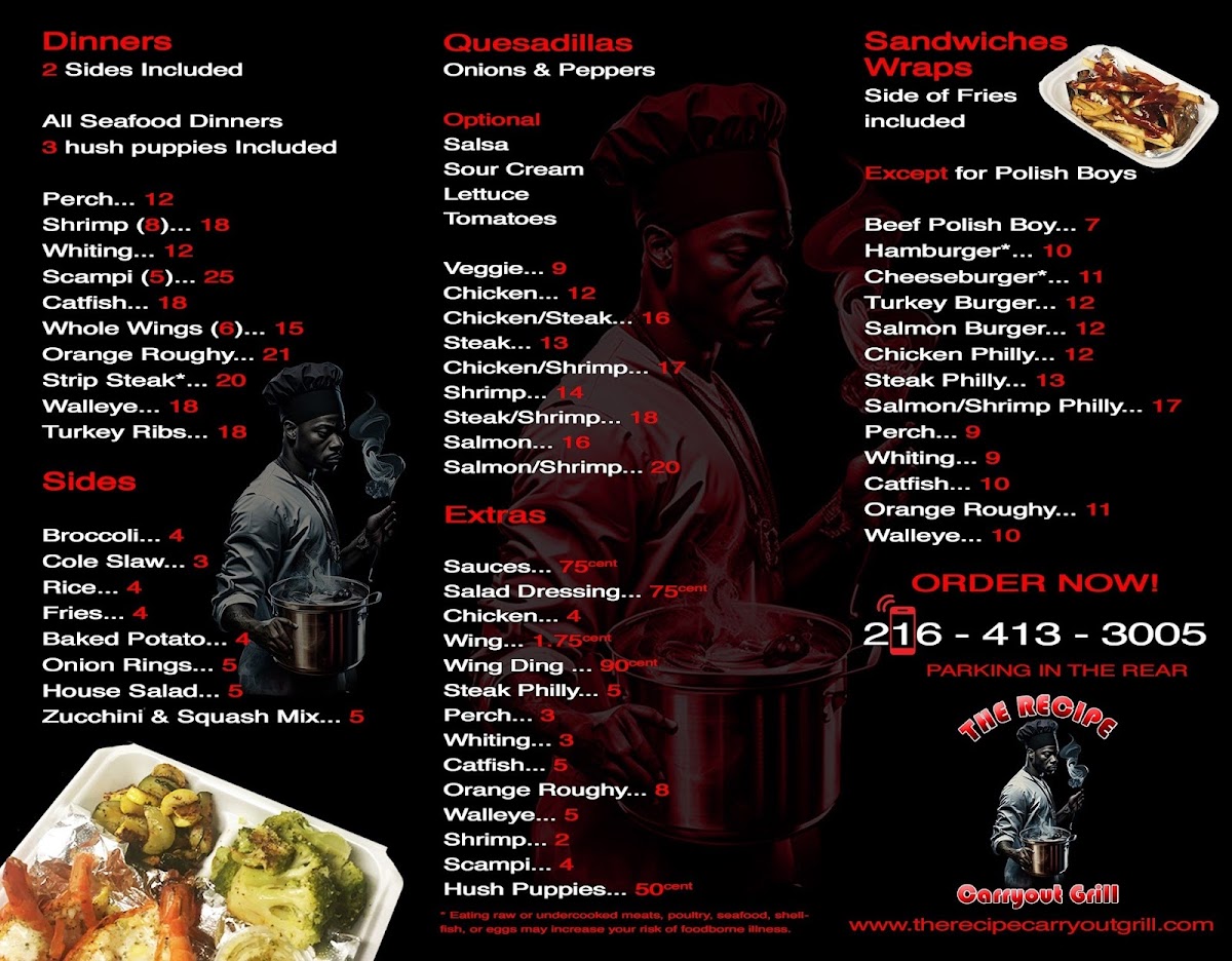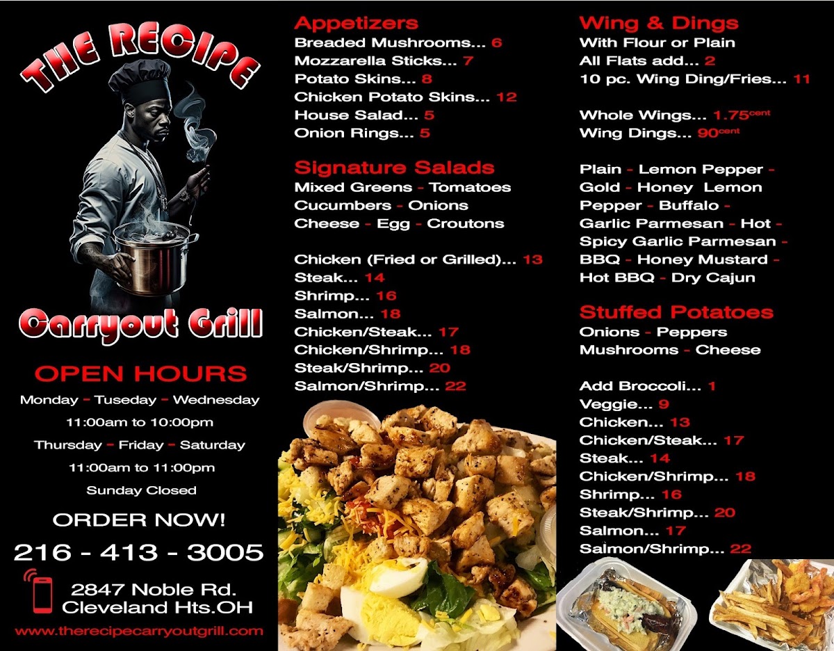 Welcome to The Recipe Carryout Grill, a hidden gem nestled in Cleveland Heights. This restaurant specializes in delivering mouthwatering comfort food that keeps customers coming back for more. Their menu features an enticing selection of appetizers, including crispy Onion Rings and savory Potato Skins, setting the stage for heartier fare.